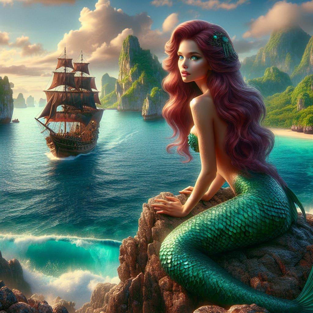 A captivating image of a mermaid with emerald scales and burgundy hair observing a ship sailing toward a verdant island. The scene is bathed in the warm glow of the late afternoon sun.