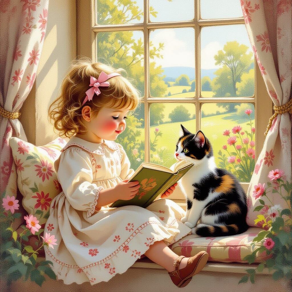 A heartwarming image of a toddler girl reading with her kitten in an English cottage. This illustration evokes classic children's book art with vibrant colors and intricate, hand-painted details.