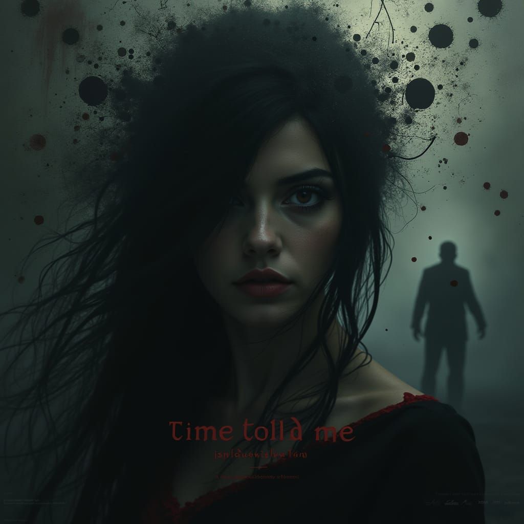 A striking picture of a woman in a gothic horror movie poster. The image features dark shadows, cracked clocks, and ghostly brushstrokes, creating a dramatic and unsettling atmosphere.