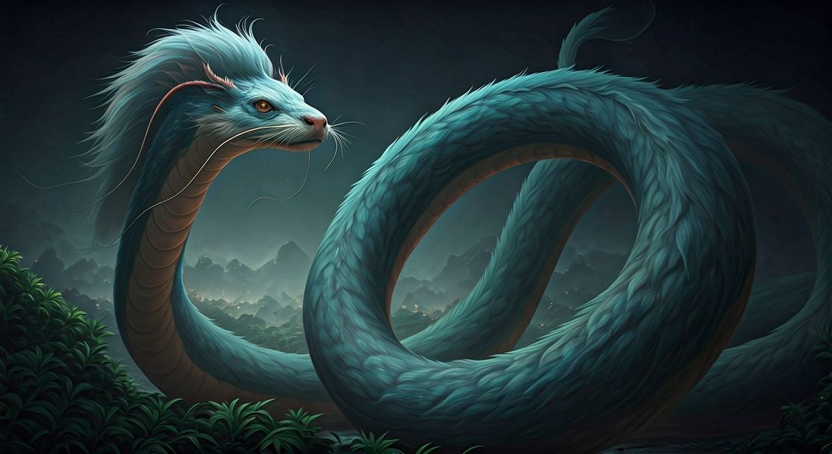 This image shows a fantastical hybrid creature with a muscular, anaconda-like body, otter's head, and tiger-like legs. The concept art features natural lighting and deep colors in a style reminiscent of Studio Ghibli anime.