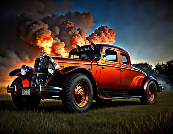 This stunning digital artwork depicts a vintage hot rod engulfed in vibrant, orange and yellow flames, set against a dark, smoky background with intricate patterns and textures, reminiscent of comic book and anime-inspired styles.