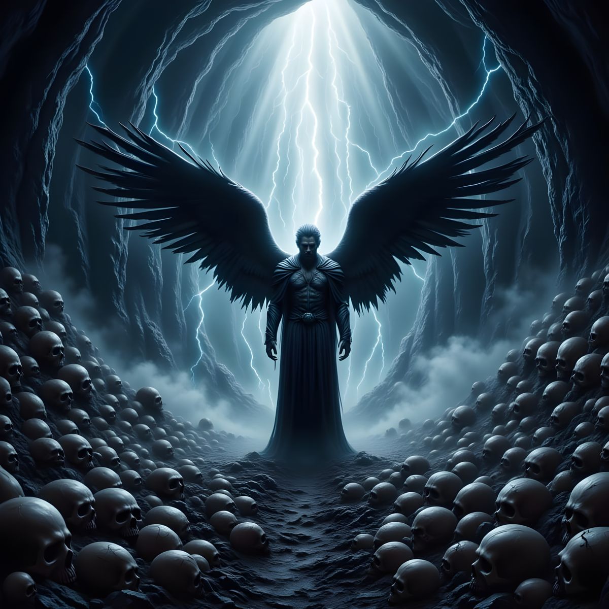 A dramatic image of a fallen angel in a skull-filled cave. The artwork features deep contrasting colors and dynamic lighting to create an ominous atmosphere, in a dark manga style.