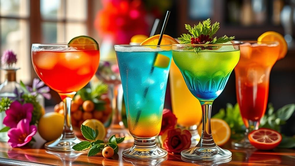 A vivid photograph of colorful cocktails in decorative glasses, adorned with garnishes, and illuminated by natural light. The image employs shallow depth of field and hyper-saturated colors for a mundane elegance.