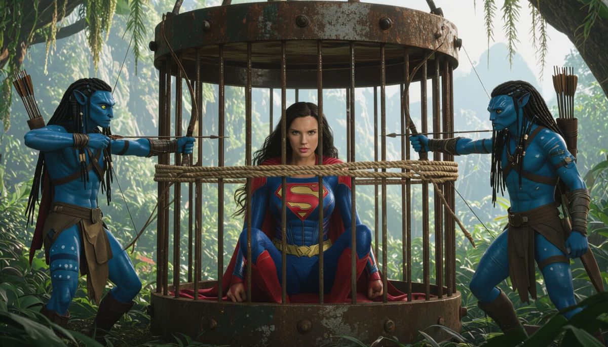 This image shows Super Girl captured in a metal cage within a dense jungle. Navi-like figures stand guard, armed with bows and arrows, in a cinematic digital art style.