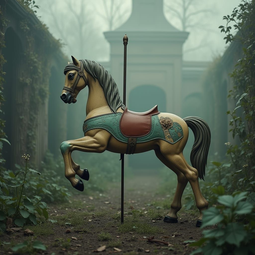 A weathered carousel horse in a forgotten Victorian garden, evoking nostalgia. The image features faded details and a soft, grainy texture, blending gothic and surreal elements.
