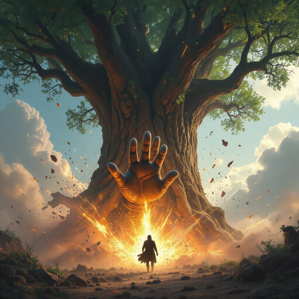 This digital matte painting shows a person's large hand breaking apart a massive tree, creating a cosmic explosion. Dramatic lighting and swirling energy highlight explosive transformation and immense scale.