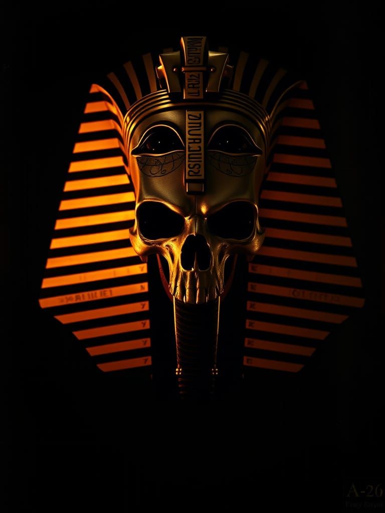 This image showcases a mysterious figure wearing an intricately designed Egyptian pharaoh head dress, adorned with realistic calligraphy and a skull, set against a dark, high-contrast background, evoking a sense of darkness and mystery reminiscent of a live-action film still.