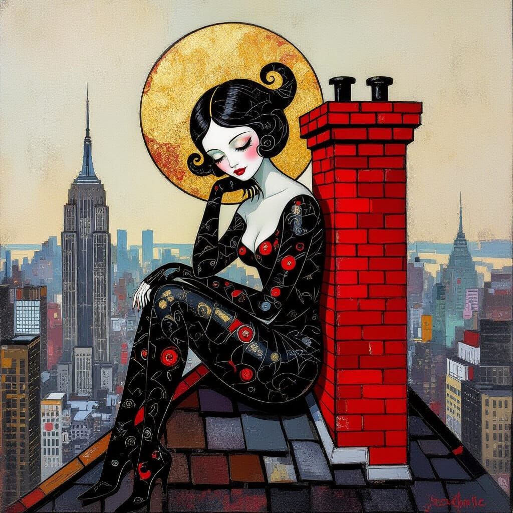 An abstract expressionist artwork featuring a shapely girl with eel-like features and a moon halo on a skyscraper roof, rendered in grunge oil colors on canvas.