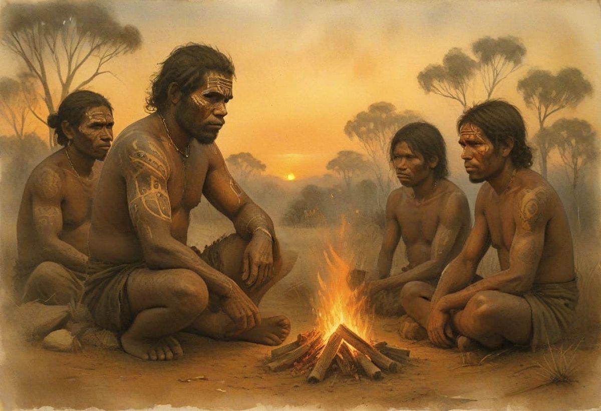 Rough faded watercolor style painting of Aboriginals with Indigenous tattoos on there face and arms, sitting by a campfire in the Australian country side by sundown