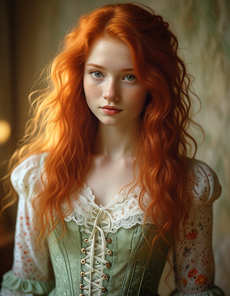 This image is a softly lit, full-body portrait of a young woman with long red hair and freckles, wearing a colorful corset and lace stockings, looking back with a smile. The dreamy atmosphere and delicate pastel colors evoke a sense of ethereal romance.