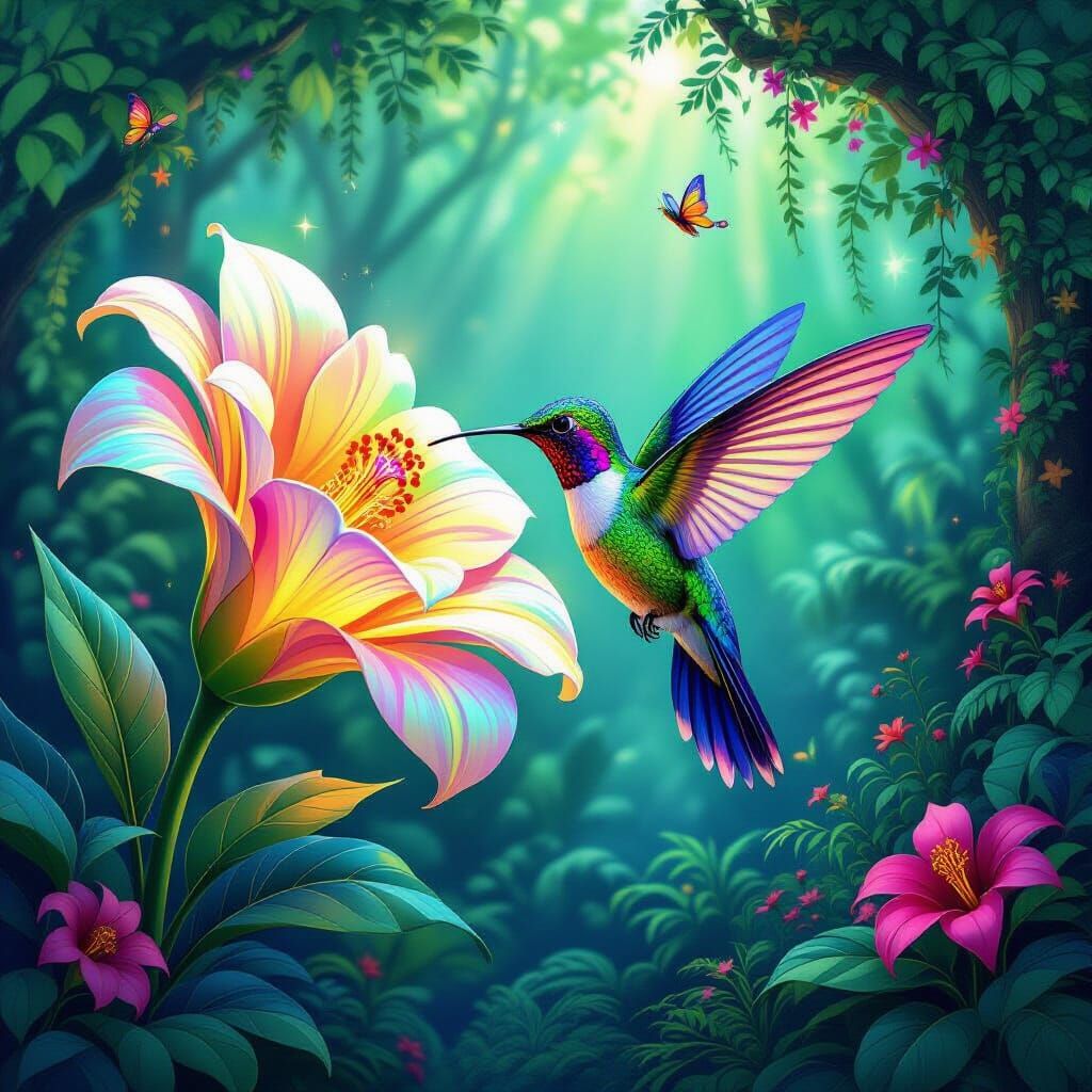 A vibrant image of a rainbow hummingbird feeding on a bioluminescent flower, set in an enchanted forest. The scene evokes Art Nouveau with psychedelic elements, creating a sense of wonder.