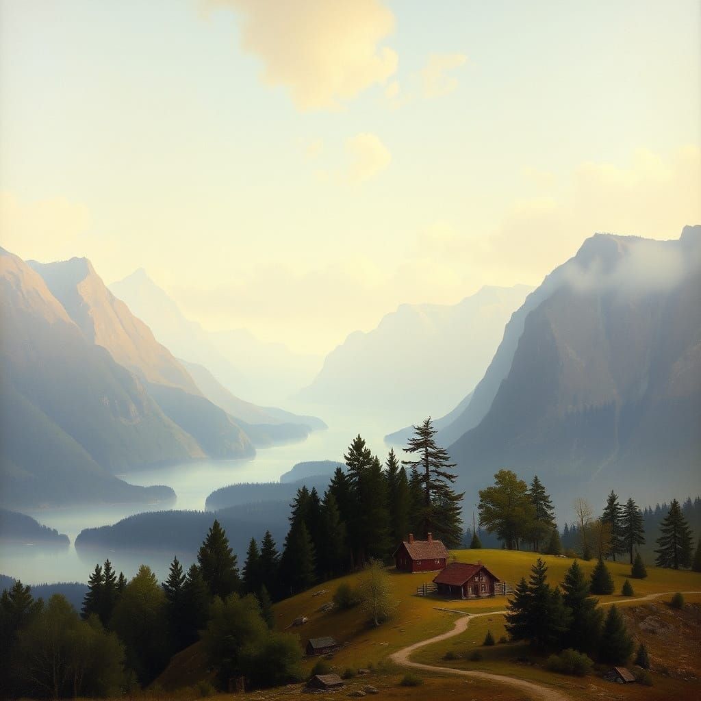 Generate your own Norwegian landscapes inspired by masters like Hans Gude. Free and easy AI art creation.