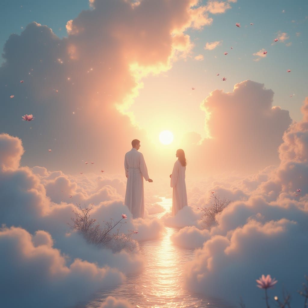 This image shows a serene, ethereal landscape of wispy clouds, bathed in soft white light, with a crystal-clear waterfall and peaceful, robed figures in tranquil contemplation. The scene is set against a kaleidoscope of soft pastel hues, with delicate lotus flowers and shimmering musical notes floating i...