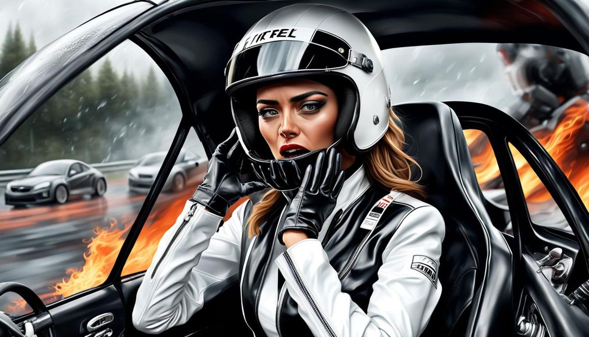 A hyperrealistic digital painting of a distressed woman in a racing suit. The woman is in a burning race car during a heavy rain, rendered with dramatic lighting and intricate detail.