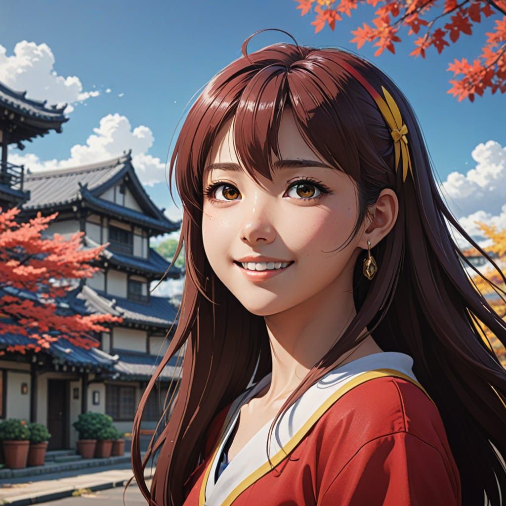This image showcases a woman with long hair, smiling and radiant, in a classic modern cinema-inspired aesthetic, with a blend of flat and cel-shaded elements, evoking a sense of wonder and joy.