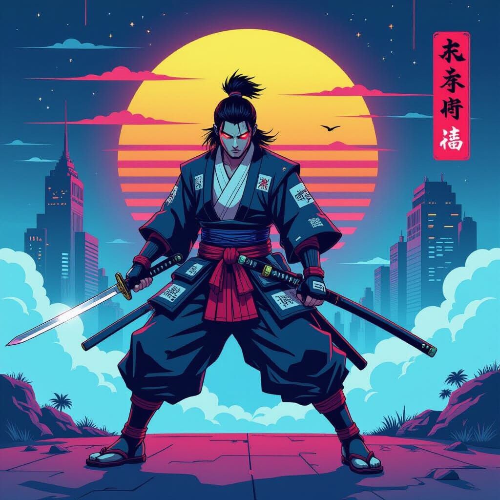 This image shows a time-traveling samurai in retro-futuristic clothing. The background is a vaporwave collage with 8-bit elements, cyber assassin details, and mystical vibes in a cartoon anime style.