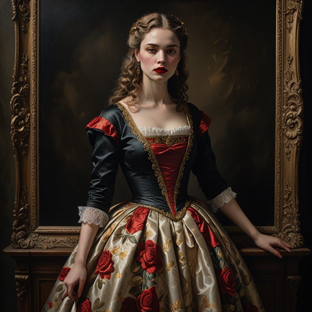 Hyperrealistic oil painting of a young woman in a studio. Features intricate gold embroidery, soft curls, and dramatic chiaroscuro lighting for a masterful, ultra-realistic effect.