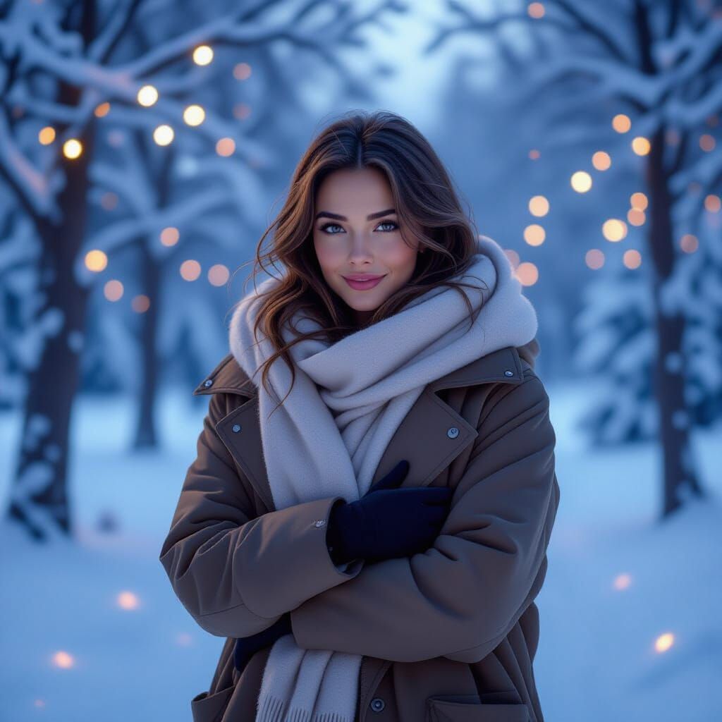 This image features a serene woman in a warm coat amidst snow-covered trees and twinkling lights. The scene uses cool colors and evokes an epic, cinematic feel.