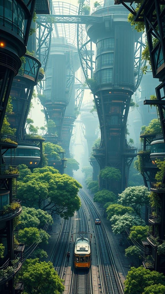 A sprawling machine-city where metal structures merge with organic life. Robotic insects fly beneath solar canopies, with steam-powered trams and biolabs creating a futuristic, bioindustrial landscape.