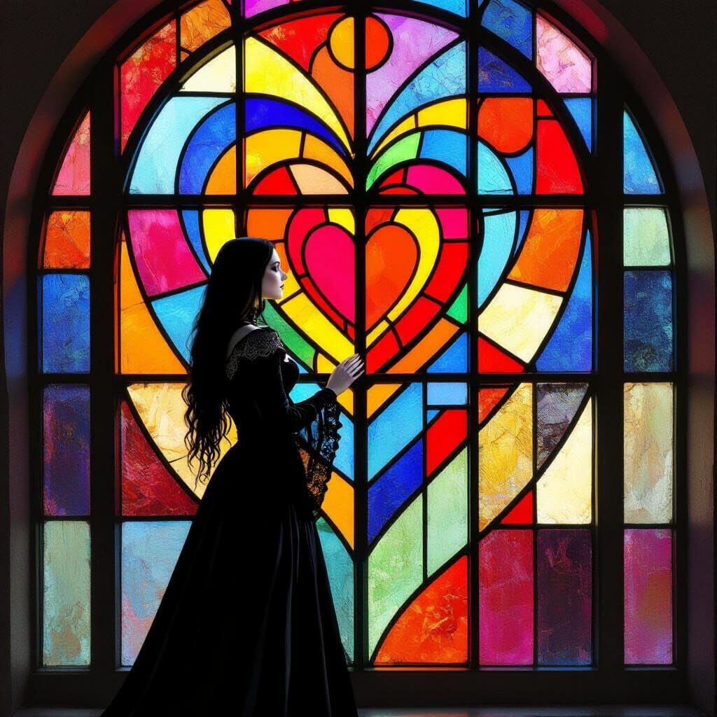 This image shows a woman in gothic dress against a sacred heart stained glass window. The artwork features bold geometric shapes and a rich color palette in an abstract style.