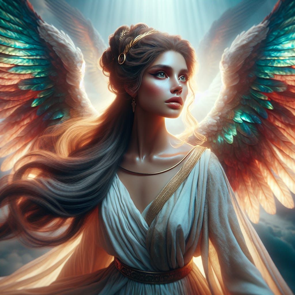 A cinematic image shows a Greek goddess with iridescent wings soaring through the sky. She has long brown hair and wears traditional Greek attire. This image has dramatic lighting and resembles a matte painting.