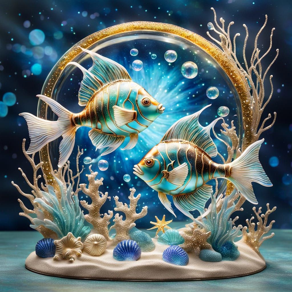 This image shows a dreamlike underwater scene featuring a pair of fish with glowing fins, a nautilus shell, and glass bubbles in a nebula-inspired background with gold stars and sand