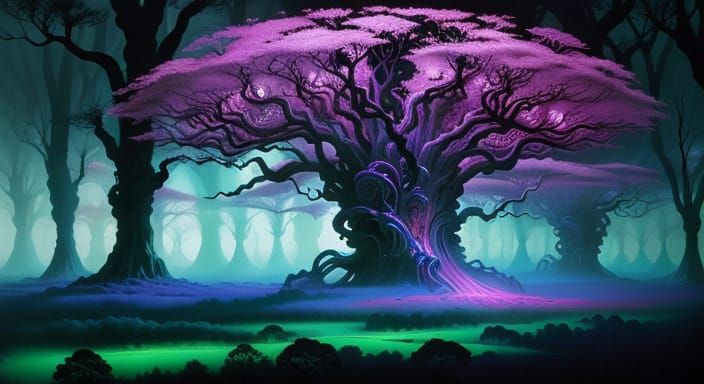 A wide shot digital painting captures a valley with oak trees and flowers, featuring vibrant colors, ethereal lighting, and intricate details in a surreal, biomechanical style.