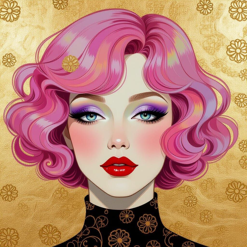 A striking image of a slender Gothic woman with pink hair and lavender eyes, adorned with peonies. Features intricate gold leaf patterning and a dreamlike, iridescent quality.