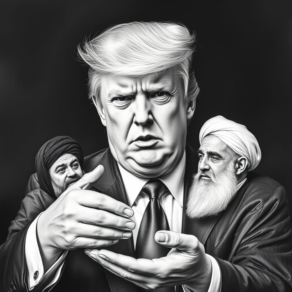 A charcoal drawing depicts Donald Trump holding two figures in his palm. The artwork is rendered with hyperdetailed strokes in a chalkboard paint style, emphasizing Trump's angry expression.