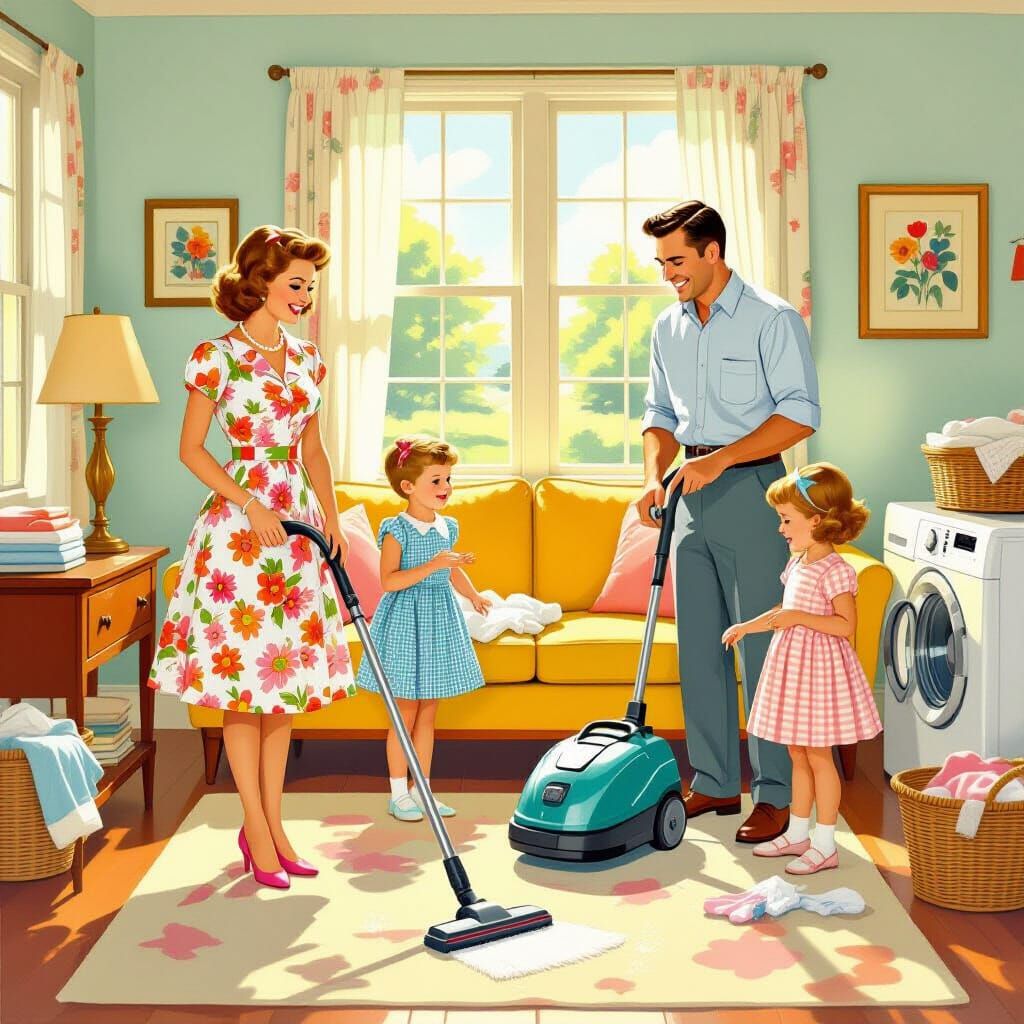 This image shows a family from the 1960s doing chores in their pastel-colored living room. Evokes a nostalgic and whimsical style reminiscent of mid-century illustrations.