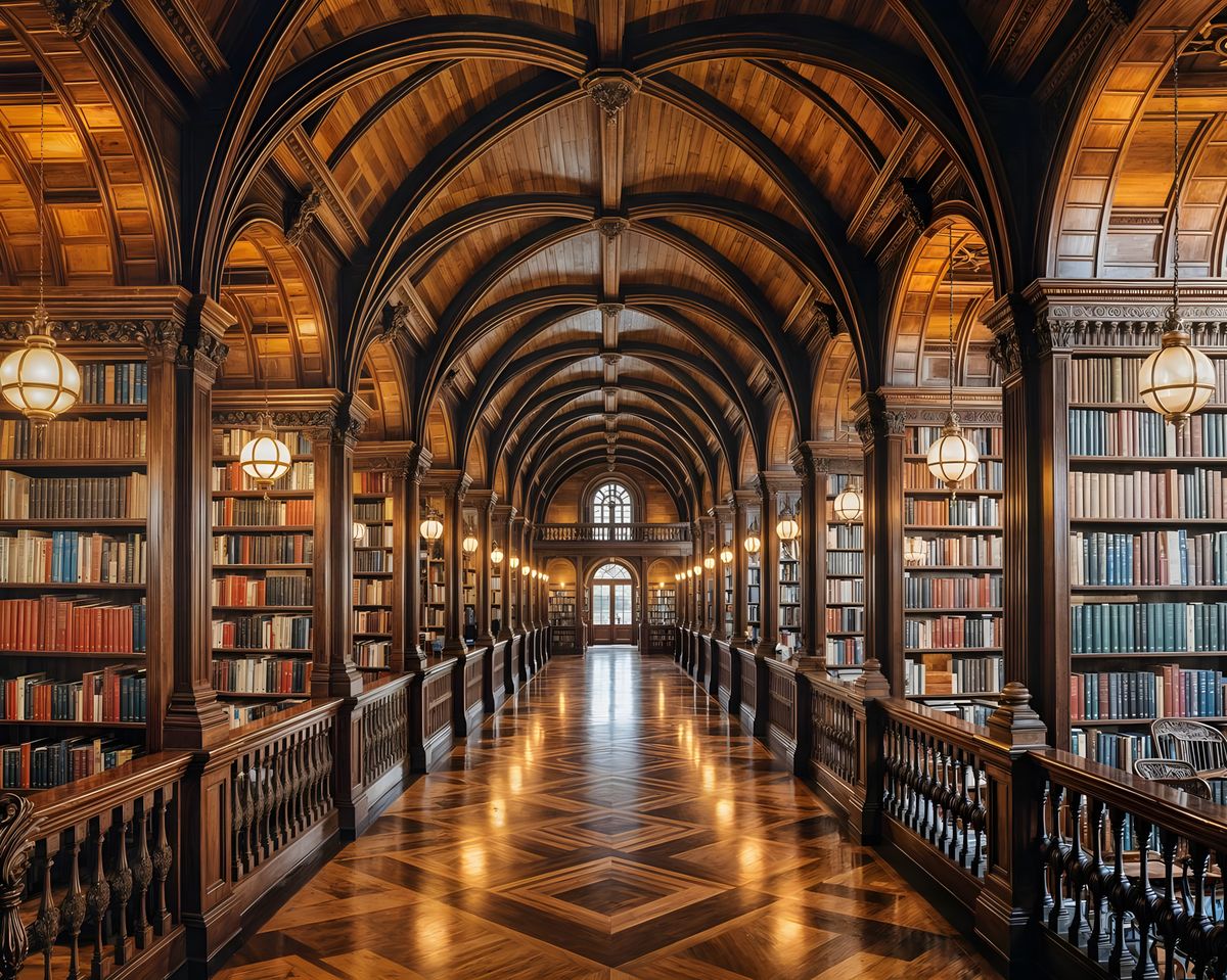 Grand Victorian Library Corridor with Gothic Arches