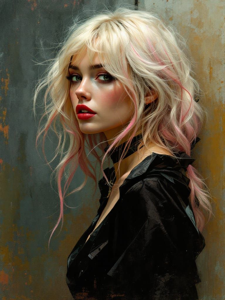 This image shows a full-body view of a 1950s future pin-up woman with pink-tipped blonde hair, featuring a bold expression and direct eye contact, rendered in an oil painting style with atmospheric textures.