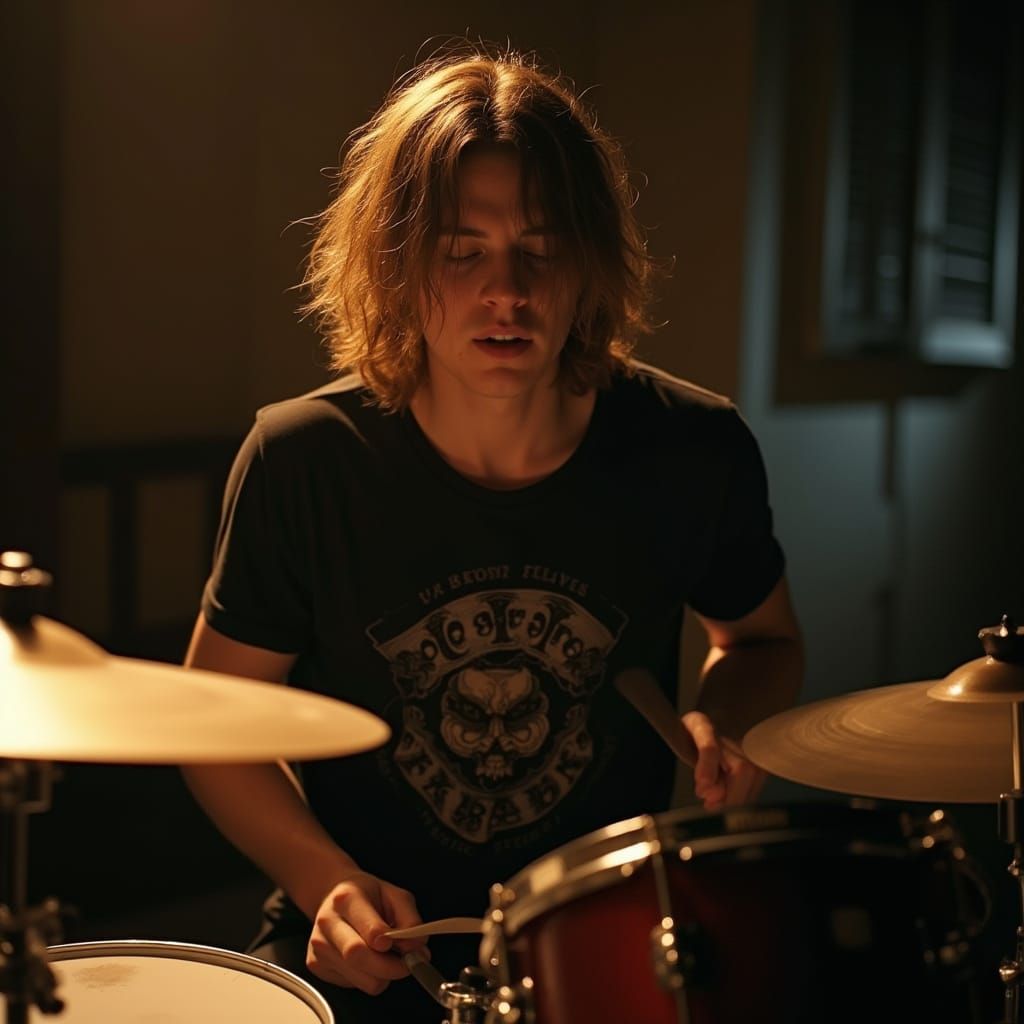 This image depicts a long-haired boy drummer, perspiring as he intensely plays. The image, with warm color grading and film grain, evokes a cinematic and dramatic atmosphere, reminiscent of live-action film.