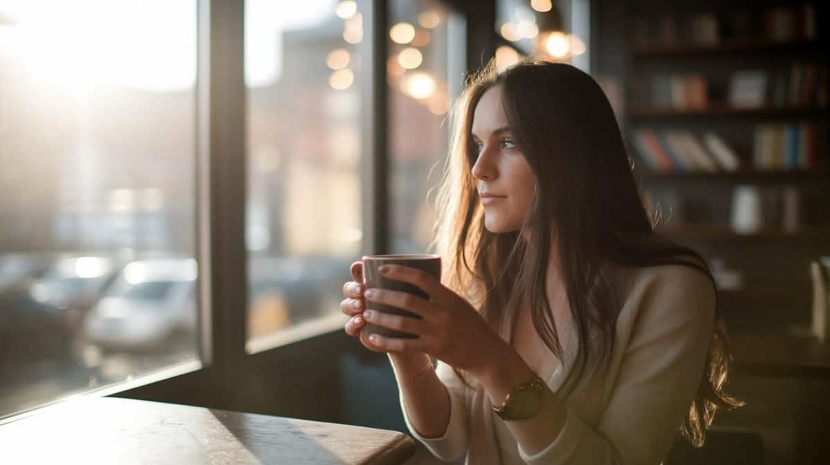 Cozy Lifestyle Moment A lifestyle photograph of a 25-year-old woman with long brown hair, sitting in a cozy, sun-drenched coffee shop. She is looking out the window, holding a ceramic mug. The composition is a medium shot, capturing the warm, inviting atmosphere. The lighting is soft morning light filtering through the window, creating a gentle glow. The style is natural and candid, emulating the look of Kodak Portra 400 film with a shallow depth of field.