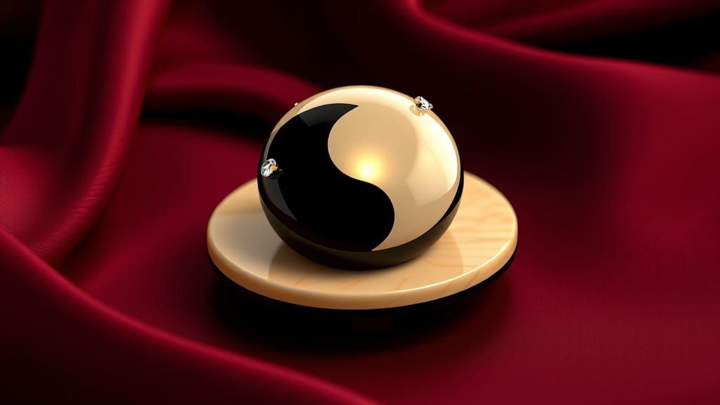 This image showcases a highly detailed, 3D-rendered onyx ring with a sleek, modern design, featuring a smooth transition from black to beige and a luminous pearl-like stone with Swarovski crystals, set against a rich burgundy background.