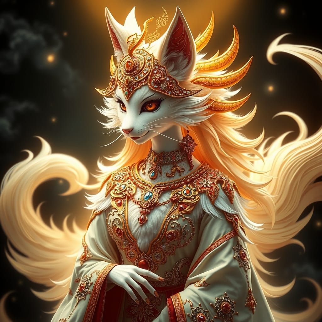 A majestic woman with nine tails and a magical aura, set against a dramatic Japanese backdrop with intricate details and hyperrealistic quality.