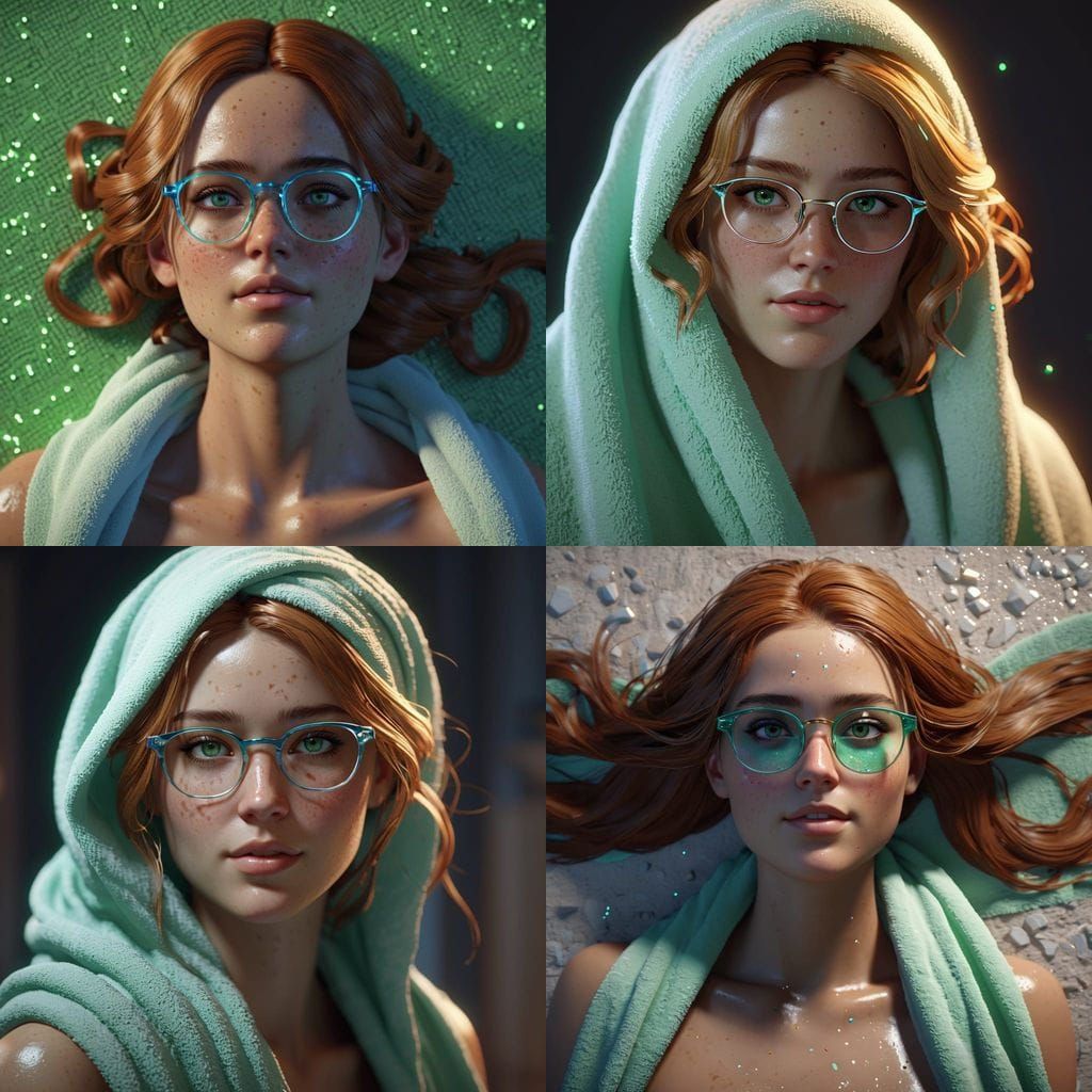 A detailed portrait of a young woman with freckles and striking green-blue eyes, captured in a realistic concept art style with dynamic lighting.