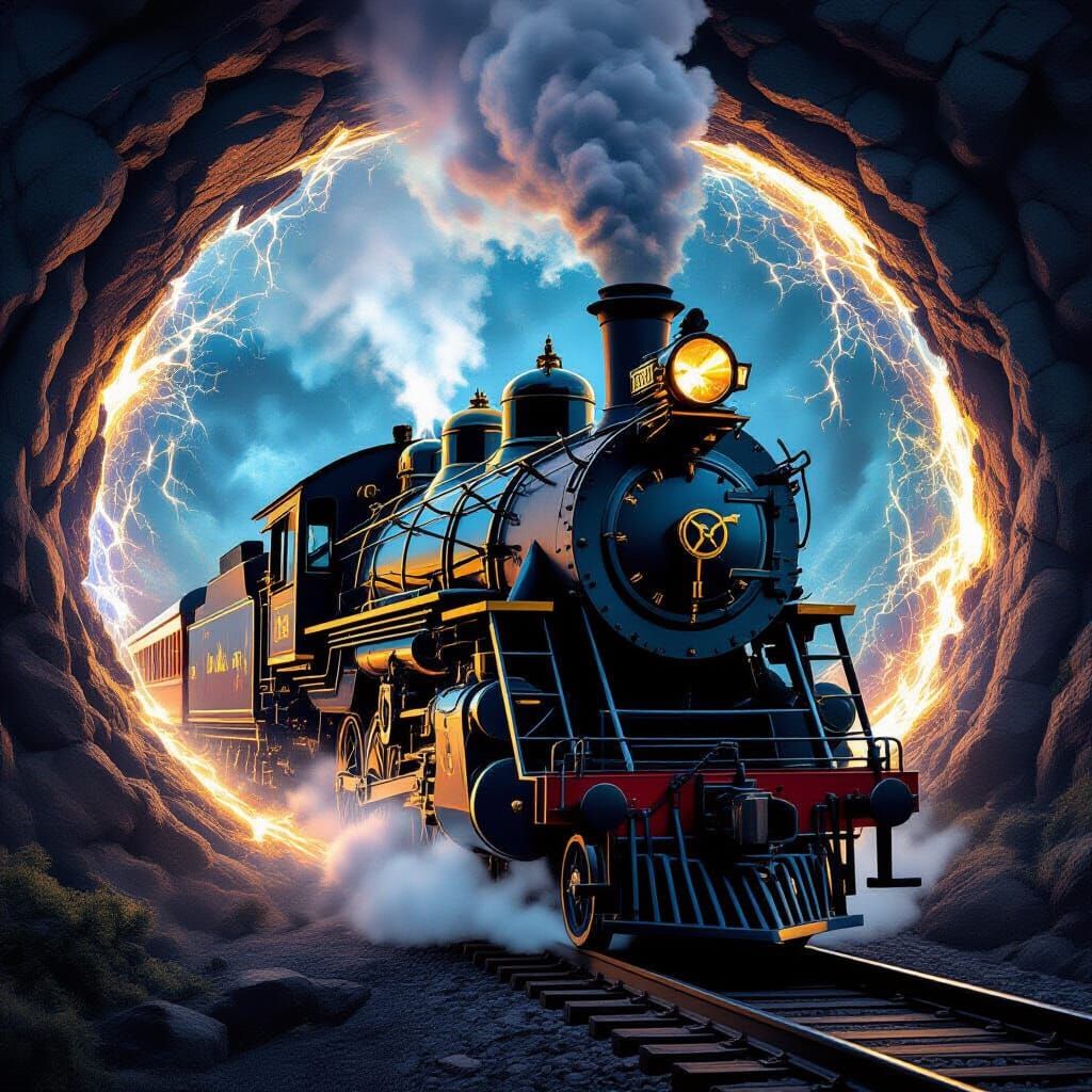 A detailed vintage steam train with a clock face emerges from a luminous magical portal. The scene features arcane energy, electric blue, violet, and gold hues in a moody, otherworldly landscape.