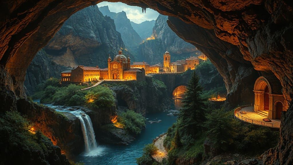 A hyper-detailed oil painting of a ruined ancient city in a cavern, featuring medieval and fantasy architecture, illuminated by warm lights and a cascading waterfall. Dark vibrant colors create a tragic yet inviting atmosphere.