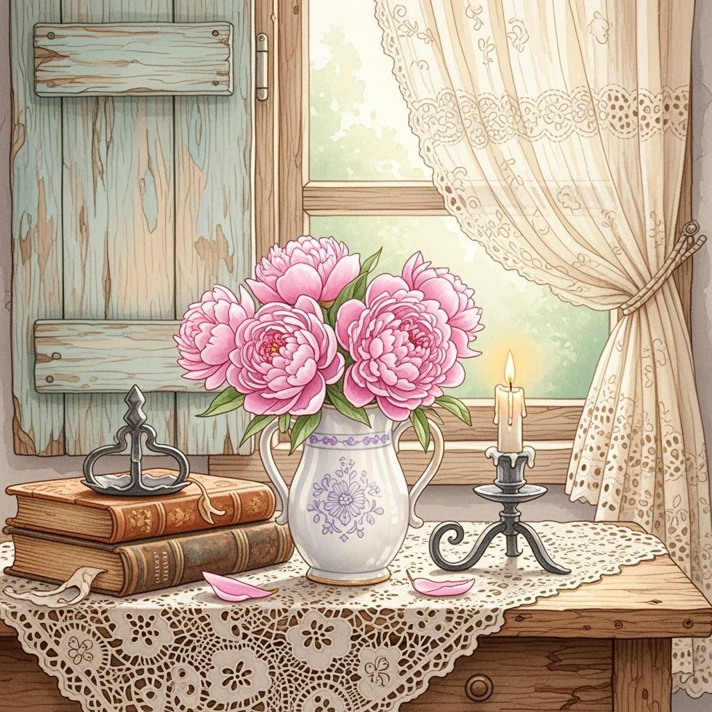 This image shows a still life of pink peonies in a vase on a lace-covered table, next to antique books and a candle. The image is rendered in watercolor and romantic realism.