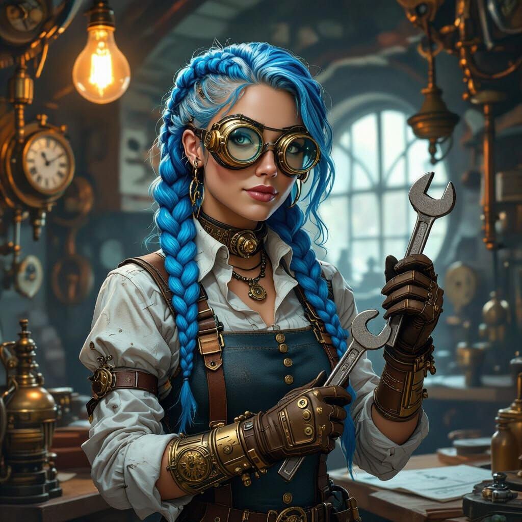 A striking picture of a non-binary engineer in a steampunk-style workshop. The engineer has long, braided blue hair with silver streaks and wears goggles while surrounded by clockwork devices in warm colors.