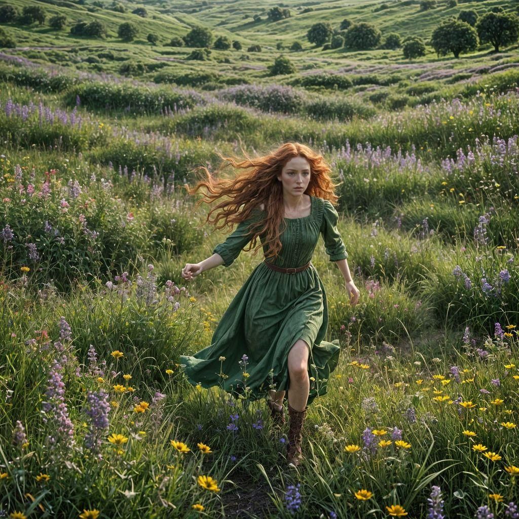 This image shows a girl with long red curly hair in a green dress running through a field of wildflowers. The image has a fantastical aesthetic and is highly detailed.