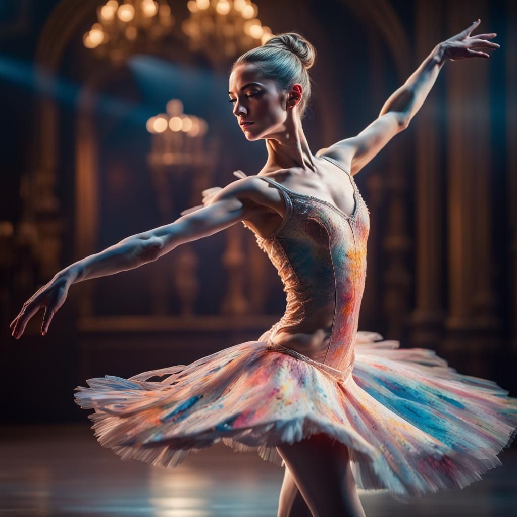 A hyperrealistic picture of a ballerina dancing to Swan Lake. The mid shot employs splash art techniques and a colorful background to highlight the dancer's dramatic performance.