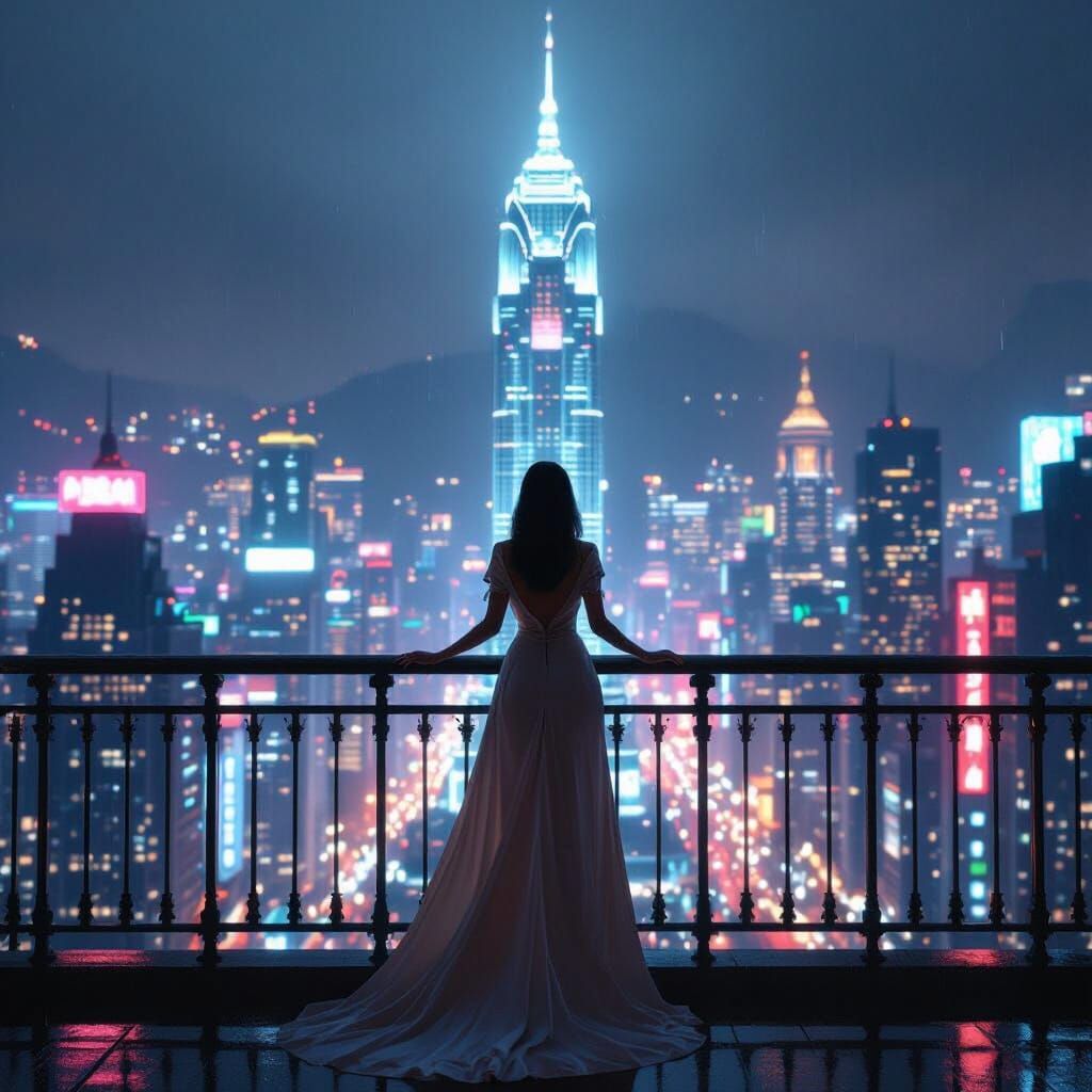 This image shows a woman on a balcony overlooking a vibrant, rainy cityscape at night. The scene blends futuristic cyberpunk elements with vintage art deco aesthetics, captured with dramatic lighting and rich colors.