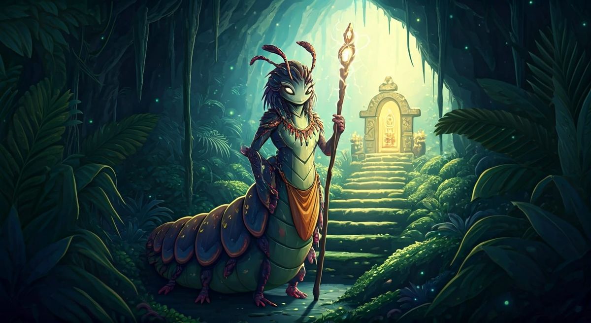 A vibrant image of an anthropomorphic caterpillar-woman holding an electrified staff. She stands before a hidden shrine in a bioluminescent cavern, surrounded by lush flora, rendered in an anime style.