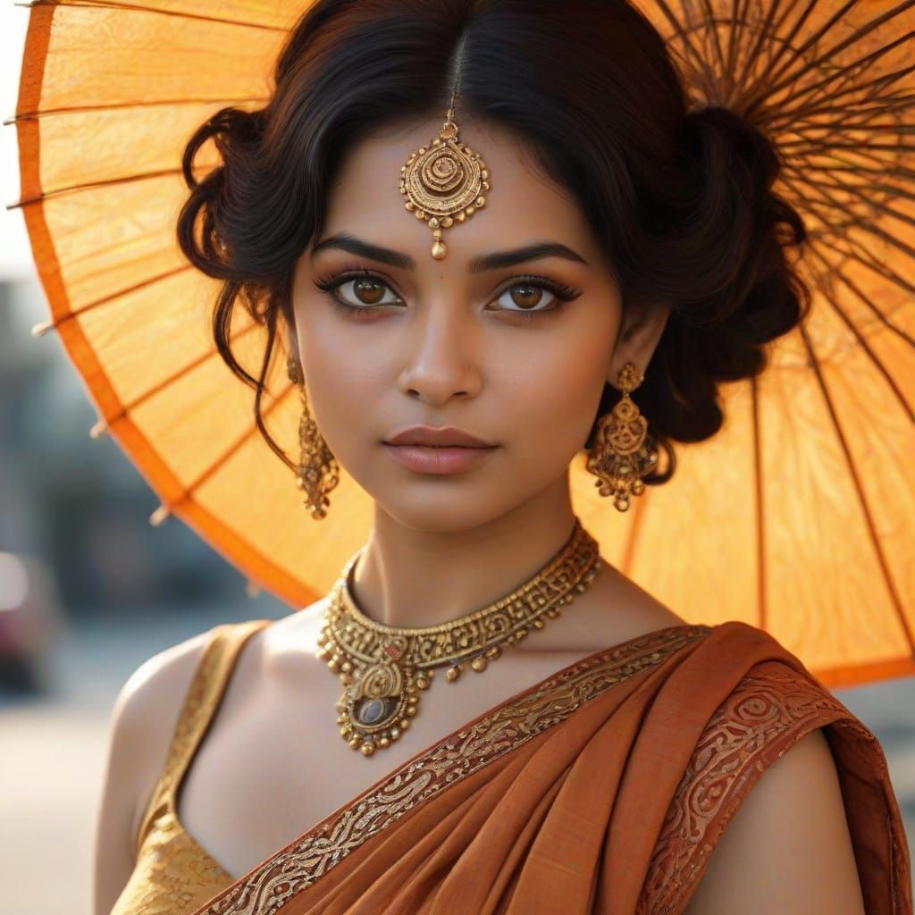 This image shows a powerful, serene siren with a deep, rich complexion and bold, colorful attire inspired by Indian heritage and pulp comic aesthetics. She wears a stunning sari-inspired skirt and gear-shaped earring, with a gold nose ring and bangles that emit steam. Her long, black hair is adorned with...