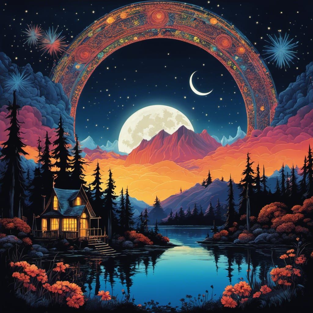 A surreal, gothic-style island scene with trees silhouetted against a midnight blue sky. Fireflies and stars illuminate a detailed background of mountains, rendered with complementary colors.