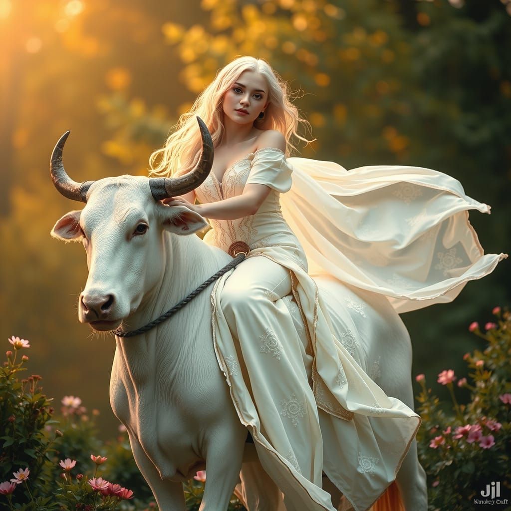 This enchanting image depicts a serene goddess with delicate features and soft pink skin, riding a majestic white bull amidst a lush, dreamlike backdrop of greenery and blooming flowers, evoking the divine feminine and pagan mysticism.