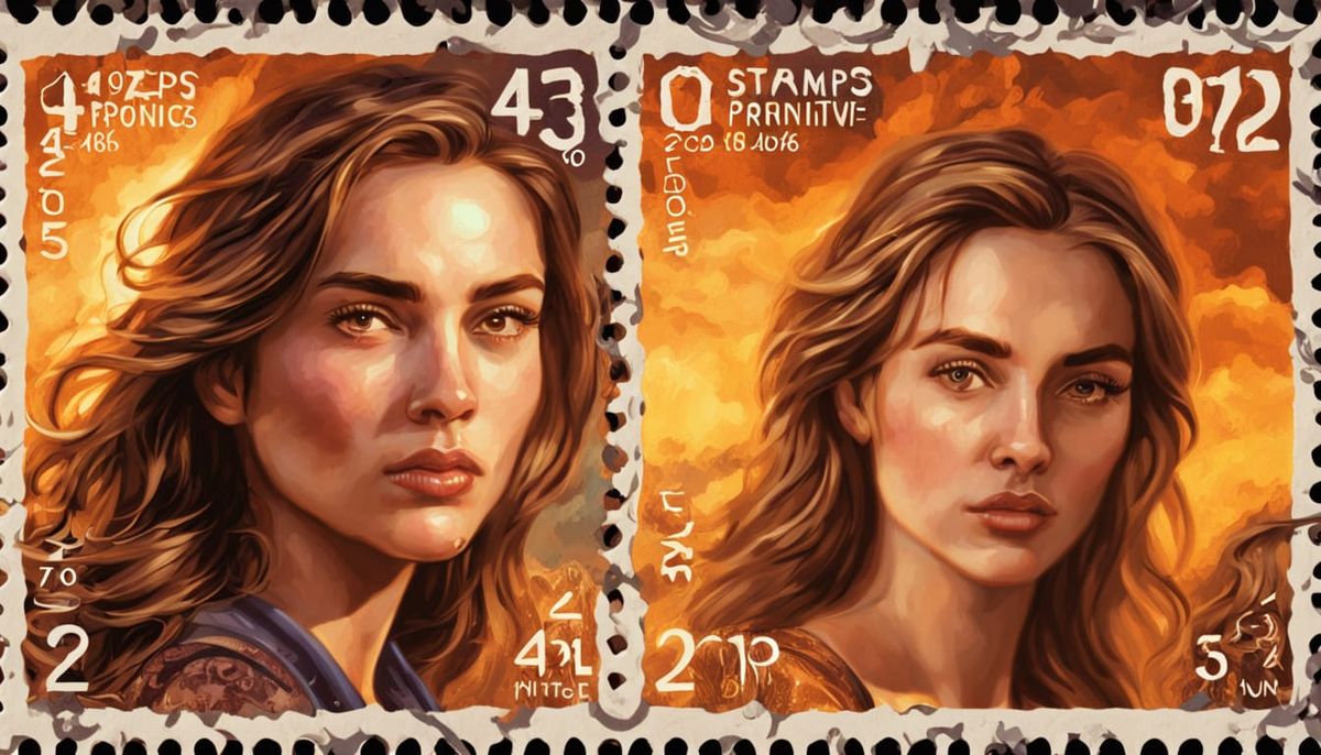 This image shows a sheet of stamps featuring portraits of women, rendered as a hyperrealistic digital matte painting. The macro photography style highlights intricate philatelic perforations with dramatic lighting and a warm golden color scheme.