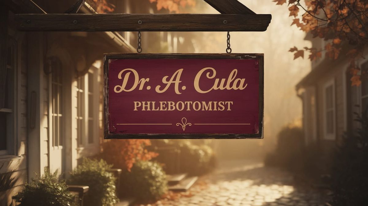 This image shows a beautifully crafted vintage sign outside a quaint doctor's office, set against a warm and inviting autumn backdrop with golden sunlight and soft shadows.